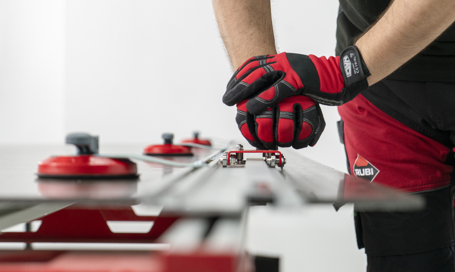 Pri rezaní a umiestňovaní veľkých dlaždíc je nevyhnutná správna opora. Na tento účel sú vhodné pracovné stoly, napr. RUBI SLAB System alebo Battipav MULTI Bench. Obidva poskytujú stabilný a ergonomický povrch pre prácu s veľkými dlaždicami.